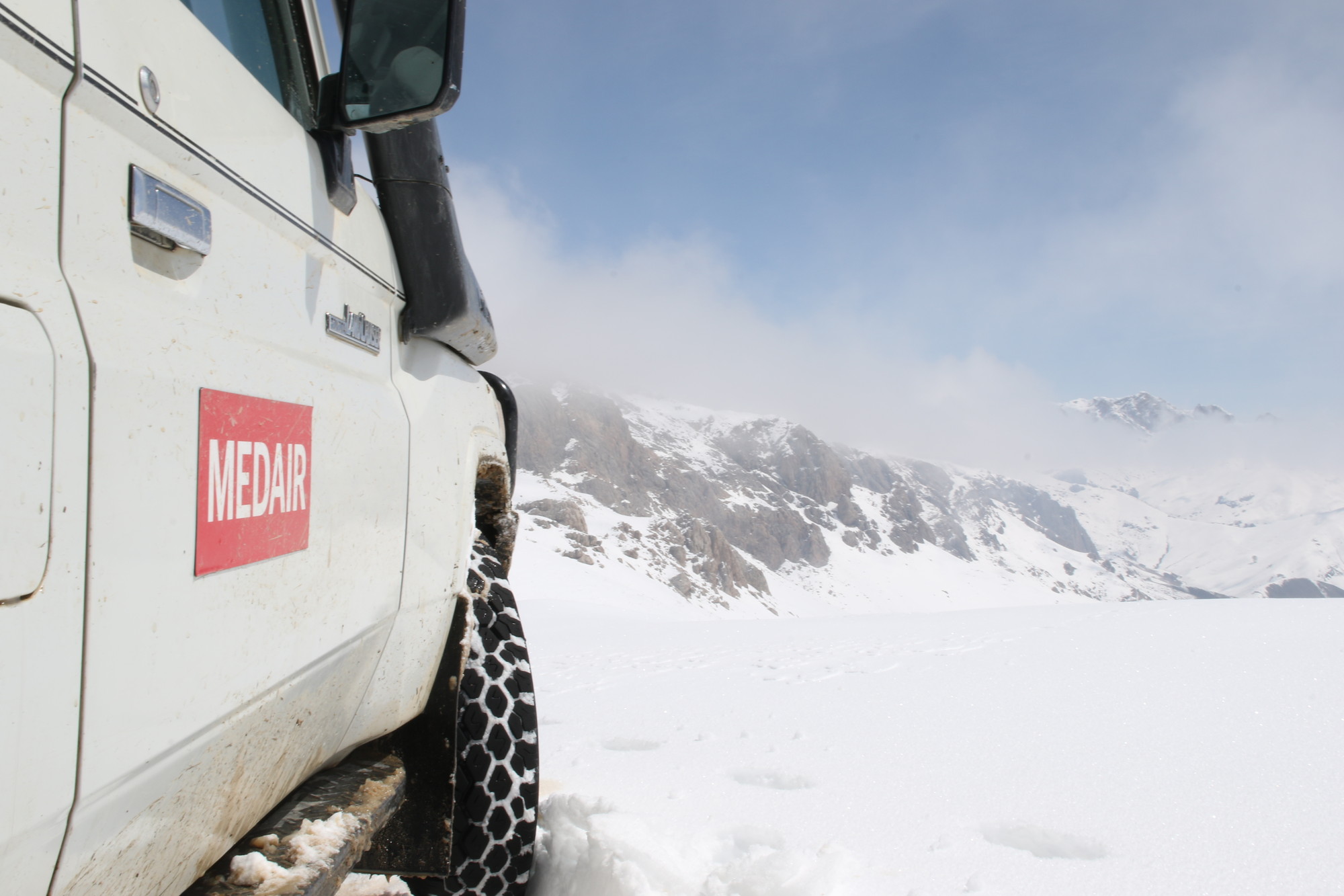 Home Struktur und Team A Medair car sits on top of a snowy mountain pass on the way to project sites in the Central Highlands.